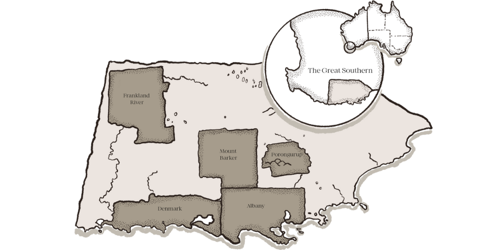 The beautiful Great Southern wine region straddles the southern coastline of Western Australia between the towns of Albany in the east and Walpole in the west and extends inland for about 150km to the north. For those lucky enough to live in the region or to enjoy nature-filled holidays here, the dominant features include beautiful beaches defined by inspiring granite outcrops and undulating topography within 50km of the Southern Ocean coastline. The landscape is covered with stands of magnificent Karri (the world’s third tallest tree) and Jarrah trees. To the north, beyond the 50km limit, the terrain is marked by a moderately elevated plateau revealing little by way of dissection.